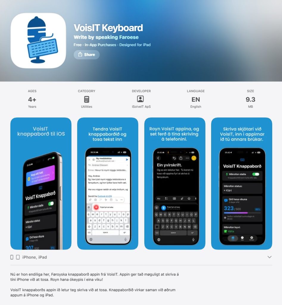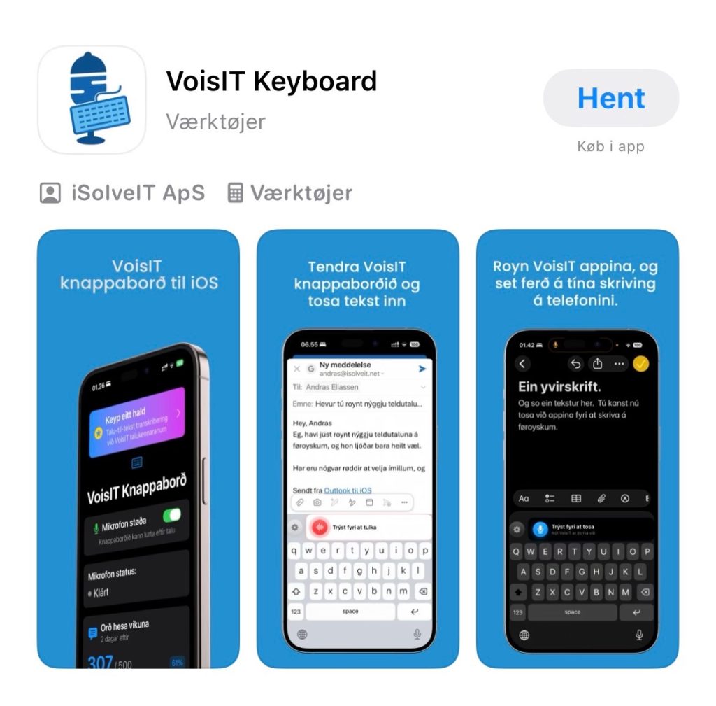 Nú er hon endiliga her, Føroyska knappaborð appin hjá VoisIT. Appin ger tað nú møguligt at skriva á tíni iPhone við at tosa.