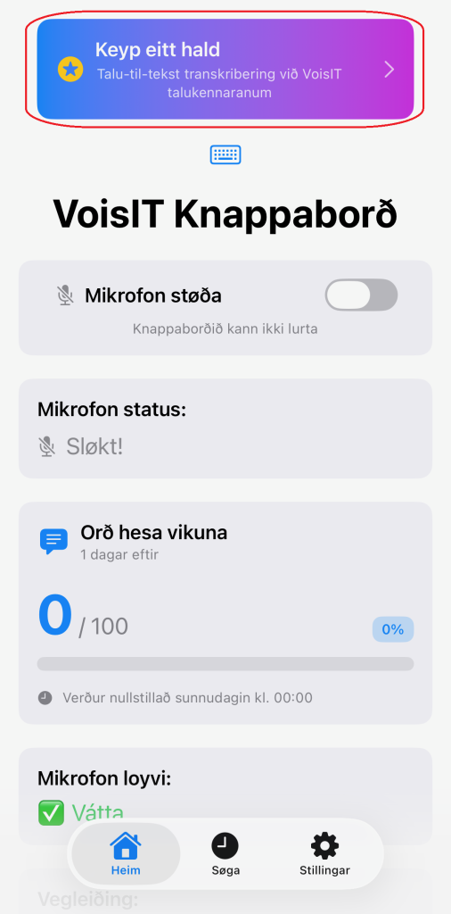 5Fyri at nýta knappaborðið, krevst eitt hald. Haldið kostar 39 kr./mð. (Tó ókeypis í 1 viku). Ovast á forsíðuni inni í appini velur tú “Keyp eitt hald”, og har kanst tú velja at gjalda mánaðarliga ella árliga.