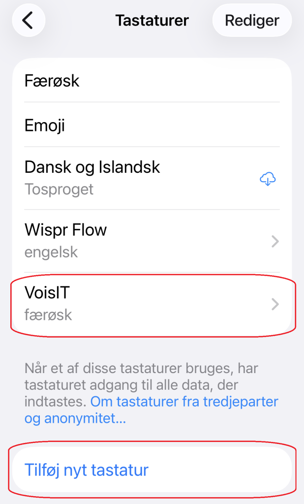 3Far inn á Indstillinger -> Generelt -> Tastatur -> Tastaturer, og legg “VoisIT” inn við at velja “Tilføj nyt tastatur” (um VoisIT ikki longu er í listanum).