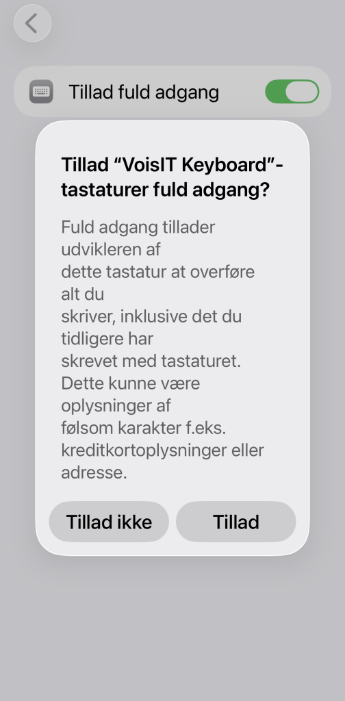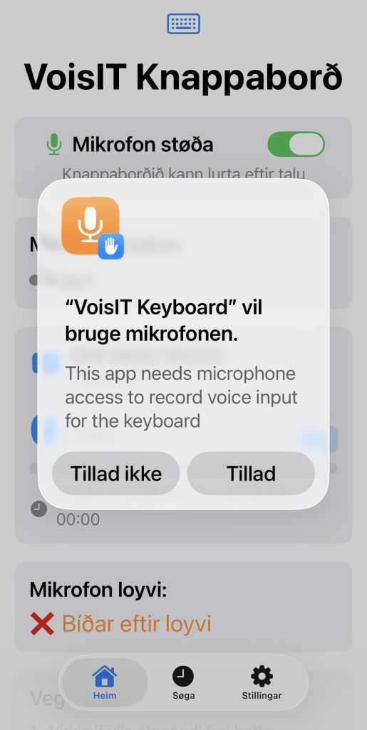 2Tá tú opnar VoisIT Keyboard fyrstu ferð, spyr appin um tú vilt loyva appini atgongd til mikrofonina. Vel her “Tillad”.